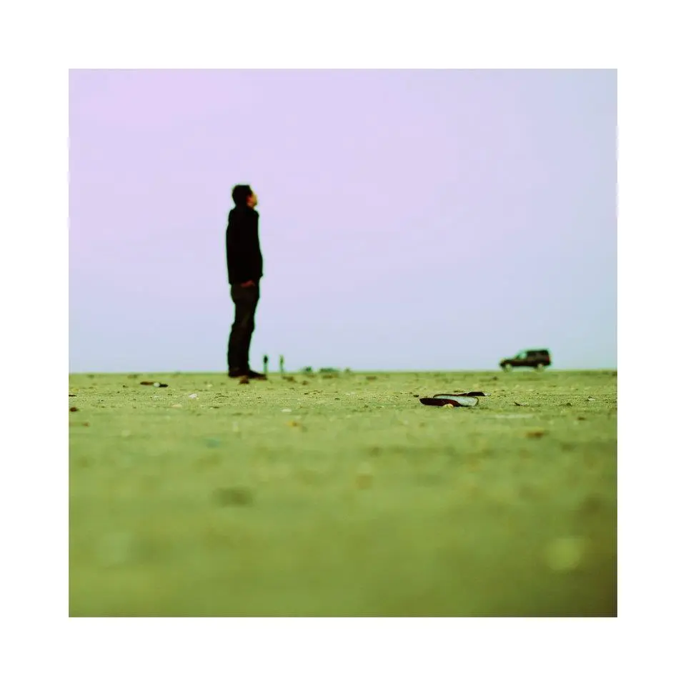 Ein Mann in schwarzer Kleidung steht allein auf einer grünen Wiese unter einem pastellfarbenen Himmel. In der Ferne sind ein Auto und vereinzelte Objekte auf dem Feld sichtbar. Die Szene vermittelt eine surreale, einsame Atmosphäre.